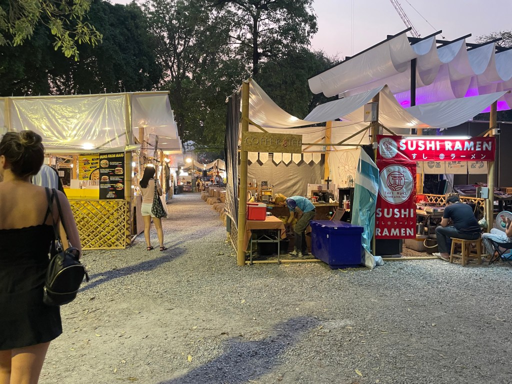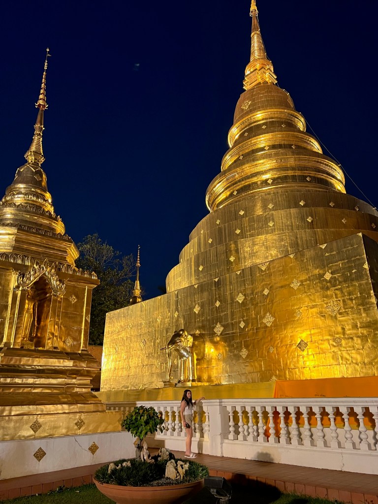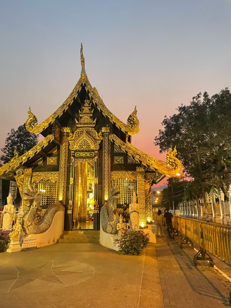 During dusk, Alex and Chrissy explored Chiang Mai but walking around a bit stumbling upon markets, live music, and gold temples with monks. They saw the Wat Inthakhin Sadue Muang with the sunset. By the time they made it to the famoua Wat Phra Singh Woramahawihan (วัดพระสิงห์วรมหาวิหาร) with minutes to spare. They snatched some pictures just in time before starting the 15 minute walk back to the hotel.