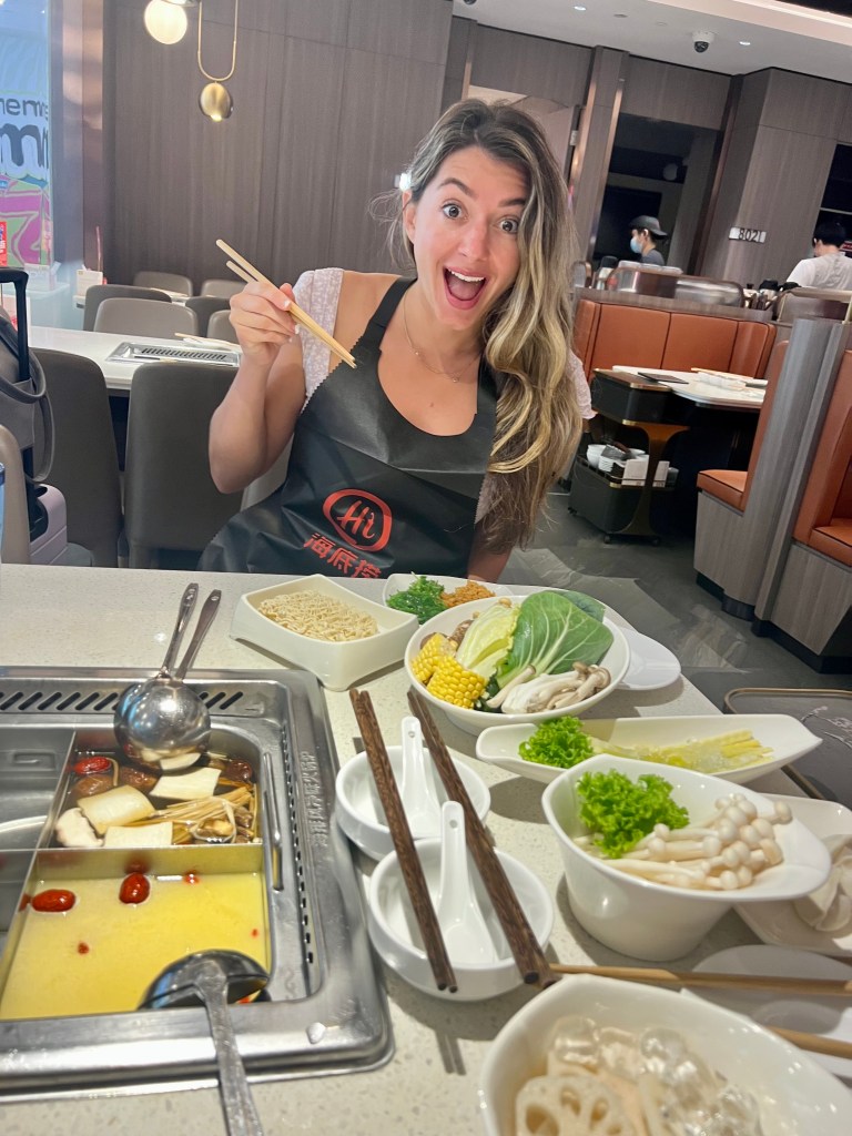 Before their flight the next day, Alex and Chrissy went to Haidilao Hotpot in the mall to see the infamous “giant noodle” and it did not disappoint! The waiter they had was so sweet and realized that Alex and Chrissy were tourists (was it the luggage that gave it away?!). He helped them figure out what sauces to create and how to order and eat the different foods.