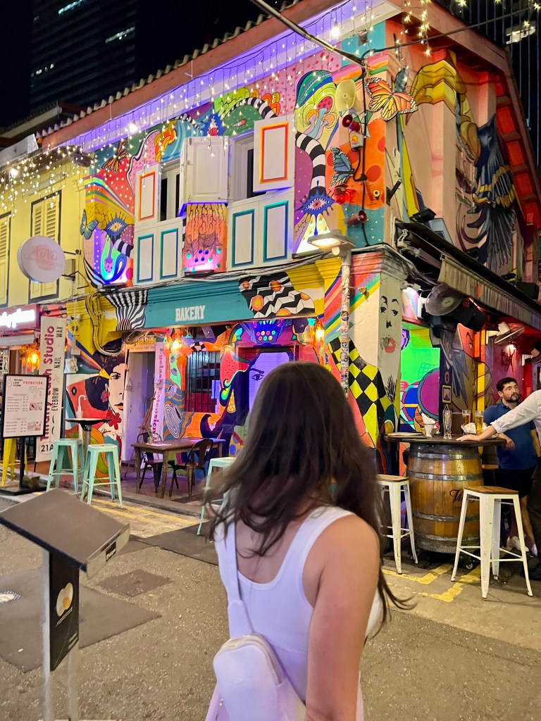 After the shock of the room wore off, they girls dined with Singapore transplant Nick at level 33, overlooking the Singapore and planned out the next day of sightseeing. Following dinner, they got drinks at Mr. Storks overlooking the city and completed the night wandering through little India. Little India was lined with colored lights, carpet stores, and bright colored buildings that made you feel like you were walking through a movie. They returned to their lavish “turned down” hotel room to already find more water, new slippers, and and updated toiletries.