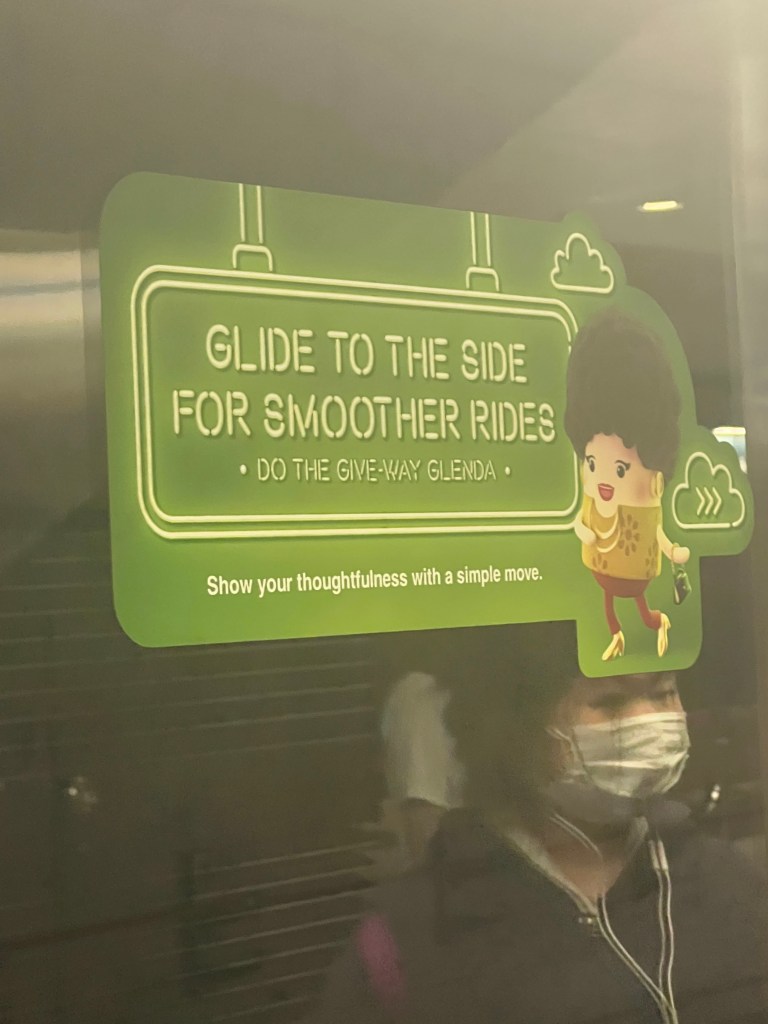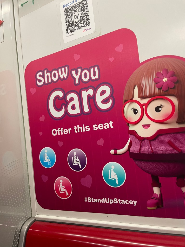 In Singapore, Alex and Chrissy were very obvious tourists and ventured, luggage and all, on the Singapore subway (MRT). The MRT created caricatures like “glide by Glenda”, “bag down Bobby” and “stand up Stacey” to promote good subway behavior (letting people get off the train before you get on, keeping bags on the floor so more people can fit, and giving up seats to those who need them more).