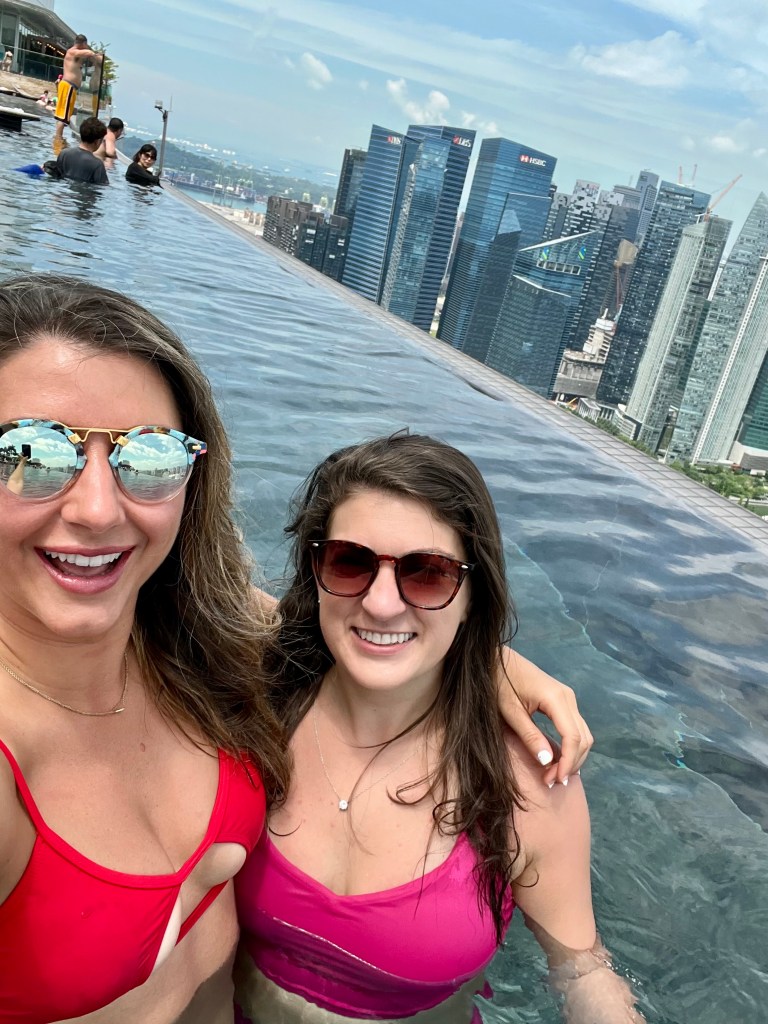 After a full nights rest, the girls were ready to seize their only full day in Singapore, and they did not waste any time. Alex and Chrissy had breakfast on their balcony and ventured to the infinity pool on the 57th floor. It is a surreal feeling wading through an infinity pool 57stories up. What they don’t tell or show you about the infinity pool is that when you get to the end, there is actually an infrastructure that’s and extra 5 feet that catches the water and has a little pathway for maintenance. It offers a very unique view of the city, and to take pictures you just need to dodge cute kids with goggles who actually use the pool to swim.